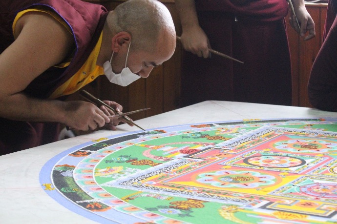 Tibetaanse Zandmandala met twee Lama's van het Sonada klooster